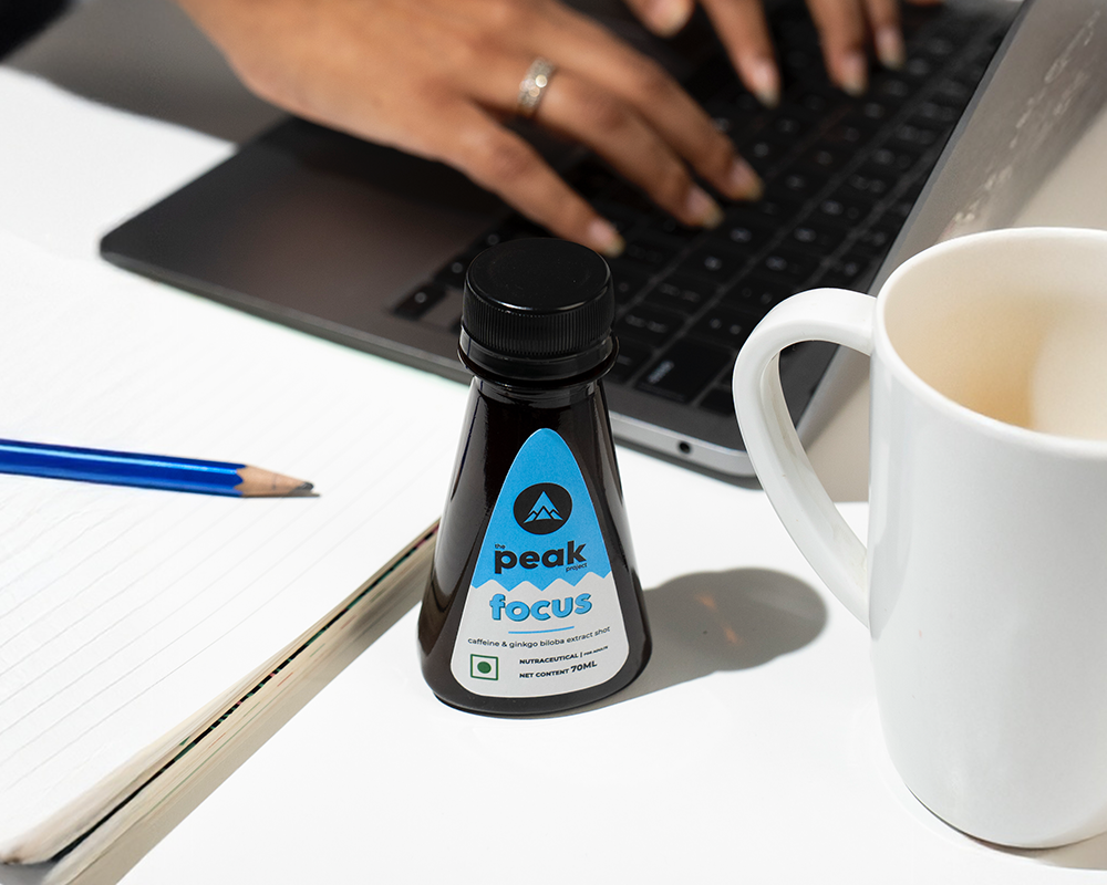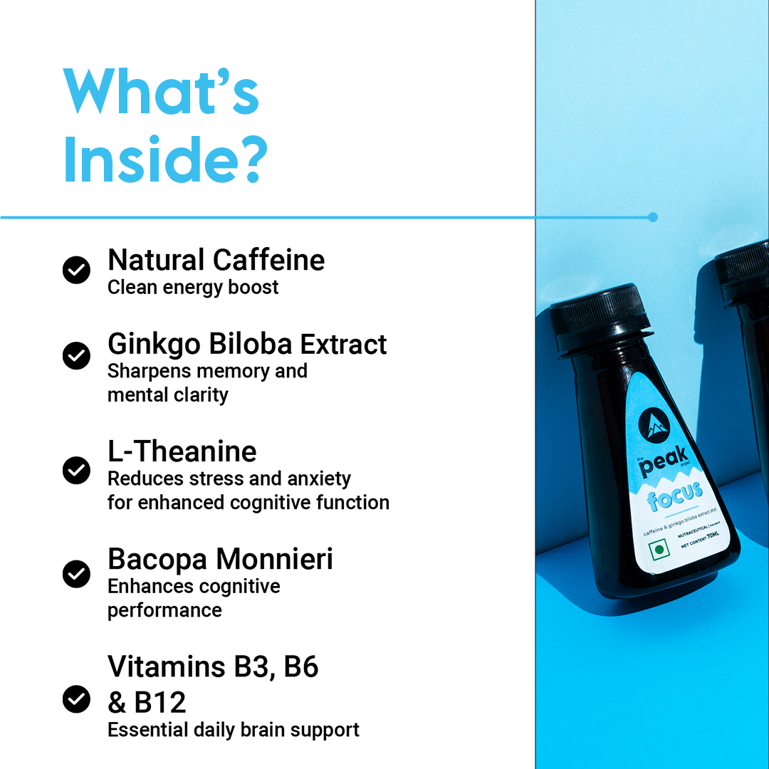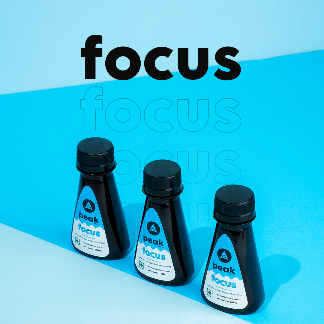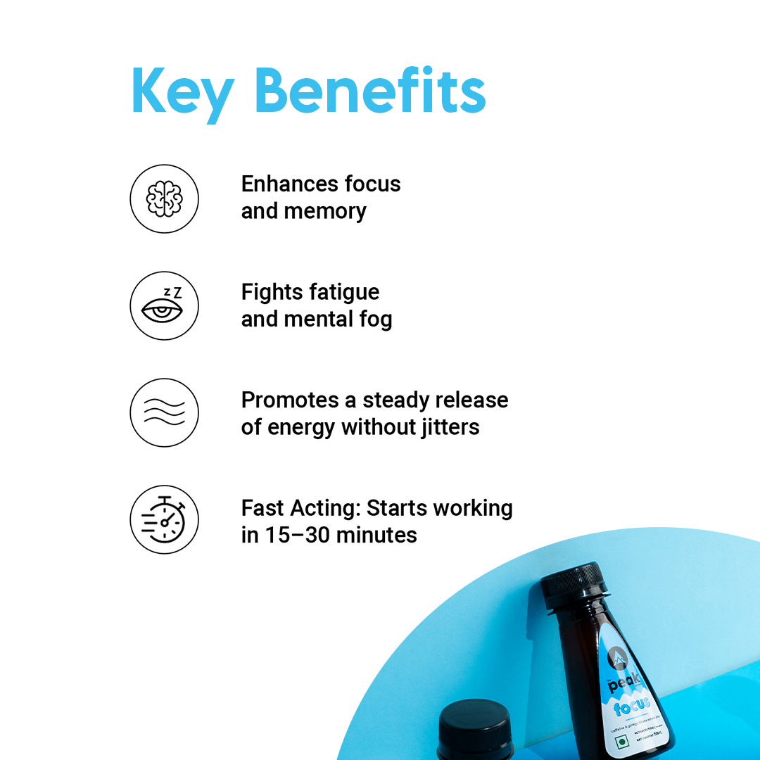Consume a Peak Focus shot once or twice daily. Starts working within 15–30 minutes to help improve focus, mental clarity, and sustained productivity.