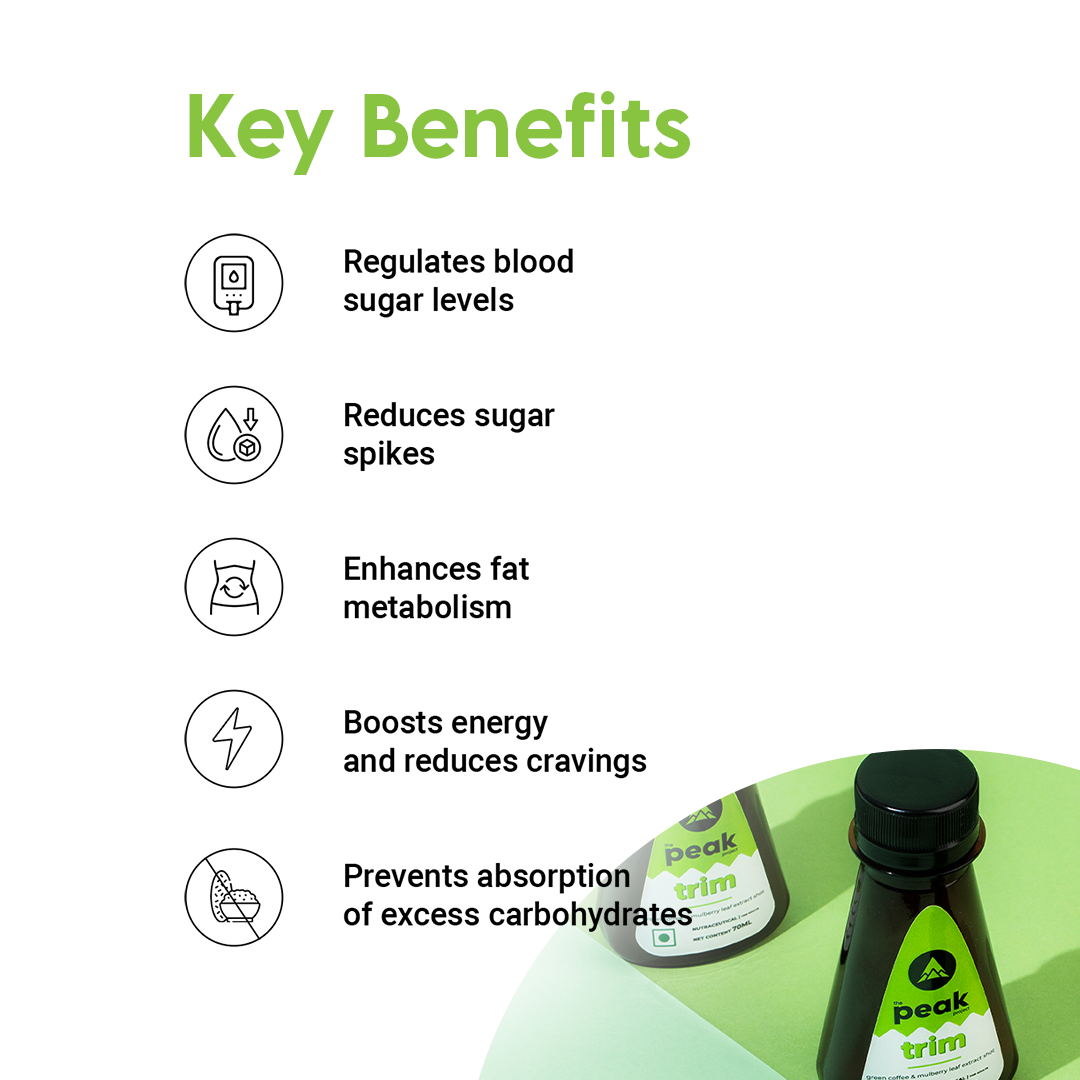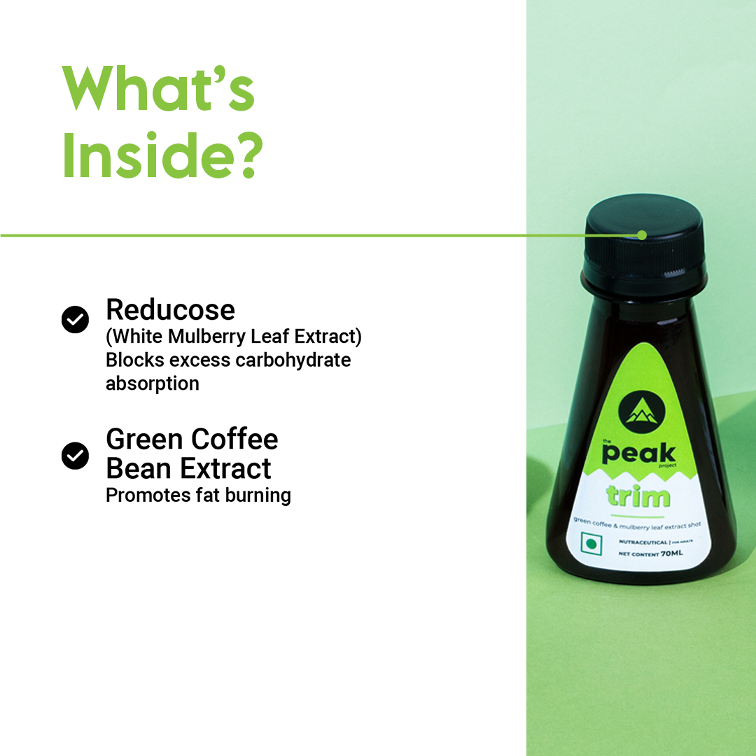 Consume a Peak Trim shot 20 minutes before your two largest meals. It slows down the absorption of carbohydrates, regulates blood sugar levels, and reduces cravings.