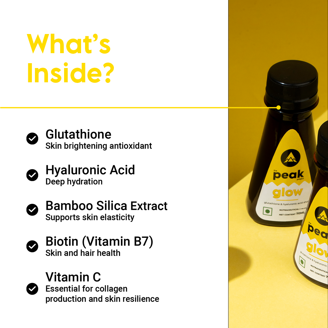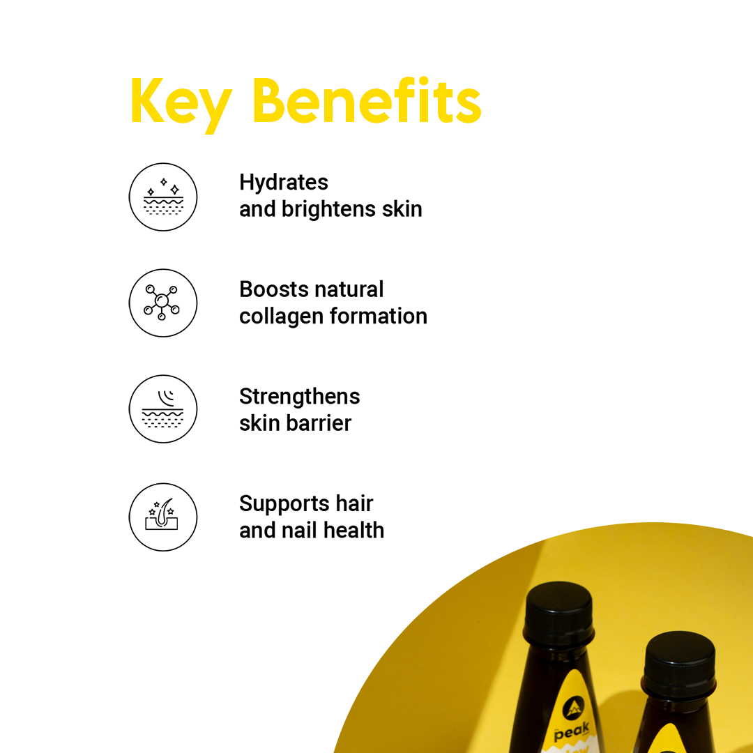 Consume a Peak Glow shot daily as part of your wellness routine. Supports collagen production, skin hydration, and healthy skin, hair, and nails from within.